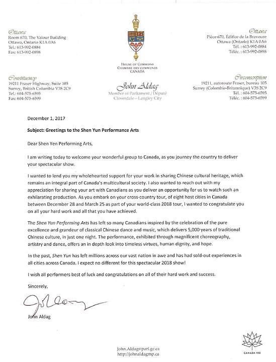 MP John Aldag je kazao: "Želim vam pružiti svesrdnu podršku vašem radu na širenju kineskog kulturnog nasljeđa, koje ostaje sasatavni dio kanadskog multikulturnog društva. Također vam želim prenijeti moje izraze zahvalnosti što svoju umjetnost dijelite sa Kanađanima pružajući nam priliku da gledamo ovako uzbudljivu predstavu. Dok krećete sa vašom turnejom po cijeloj zemlju u osam kanadskih gradova u periodu od 28. decembra i 25. marta u sklopu vaše turneje svjetske klase 2018. godine, želim da vam čestitam na cjelokupnom vašem napornom radu i onome što ste postigli."