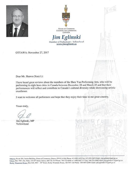 MP Jim Eglinski je rekao: "Čuo sam veoma lijepe komentare o članovima Shen Yun Performing Artsa, koji će nastupati u osam gradova domaćina u Kanadi između 28. decembra i 25. marta i njihove će predstave odražavati i dati doprinos kanadskoj kulturnoj raznolikosti kroz prikaz svoje umjetničke izvrsnosti."