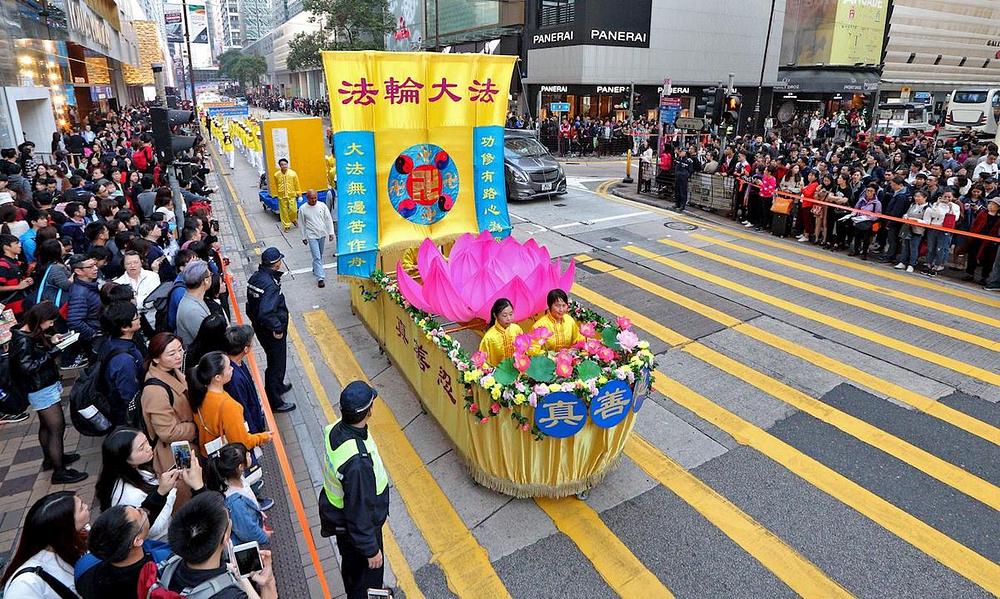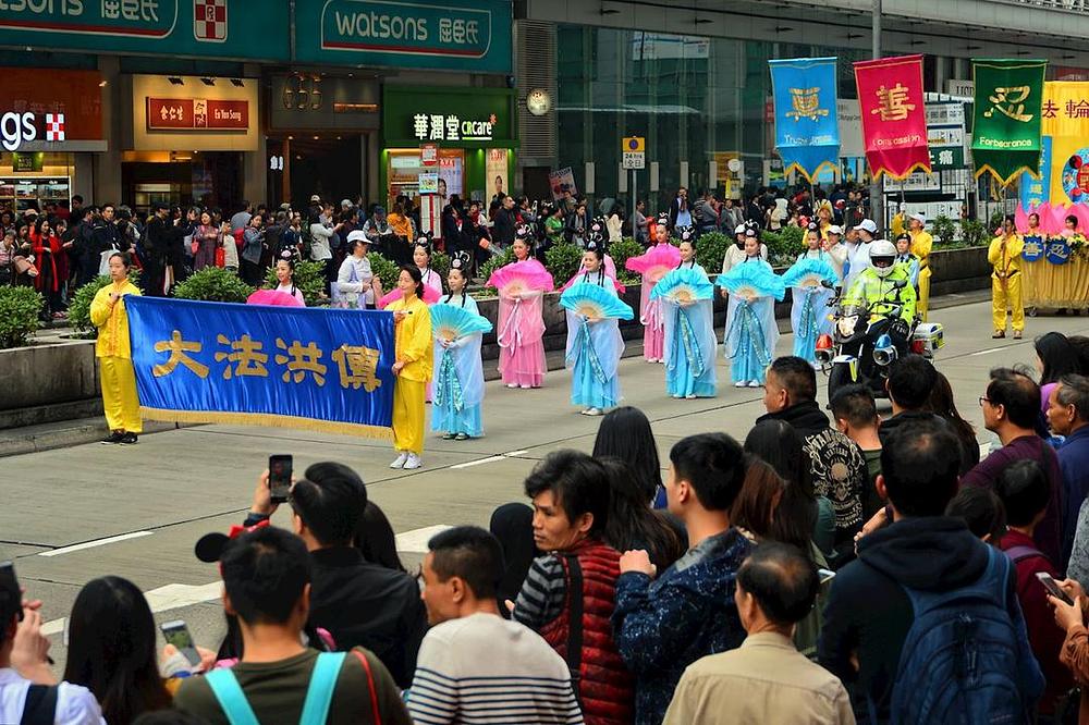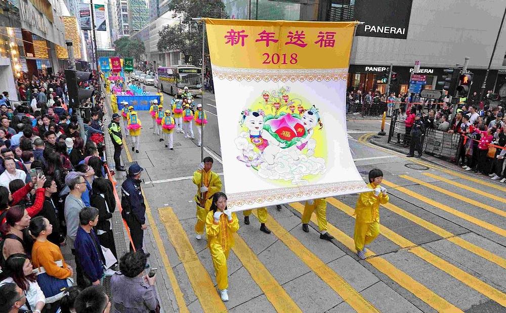 Marš praktikanata Falun Gonga na Novogodišnji dan je prošao kroz prometne ulice i područja u centru Hong Konga. Mnogi gledaoci su sretno uzeli informacione materijale i fotografisali paradu.