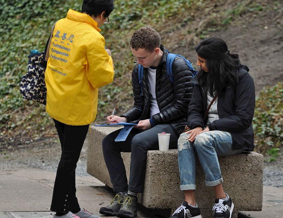 Falun Dafa praktikanti su organizovali štand za prikupljanje potpisa ispred Umjetničke galerije u Vancouveru 8. aprila 2018. Ovom su prilikom tražili od kanadskih vlasti da pozovu kinesku vladu na oslobađanje Sun Xi, kanadske državljanke i poslovne žene koja se nalazi u zatvoru u Kini.