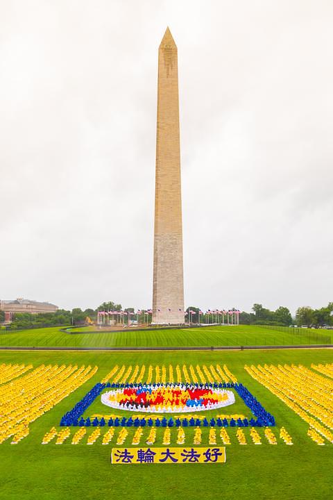 Falun Gong praktikanti pristigli iz cijelog svijeta su u jutro 22. lipnja 2018. organizirali grupno vježbanje i formiranje Falun znaka ispred spomenika Washingtonu. Iako je padala kiša, a ponekad bio i jak pljusak, praktikanti su ustrajali u vježbanju. Kasnije su odjeveni u odjeću različitih boja formirali Falun znak. Scena je odavala dojam spokoja i odlučnosti.