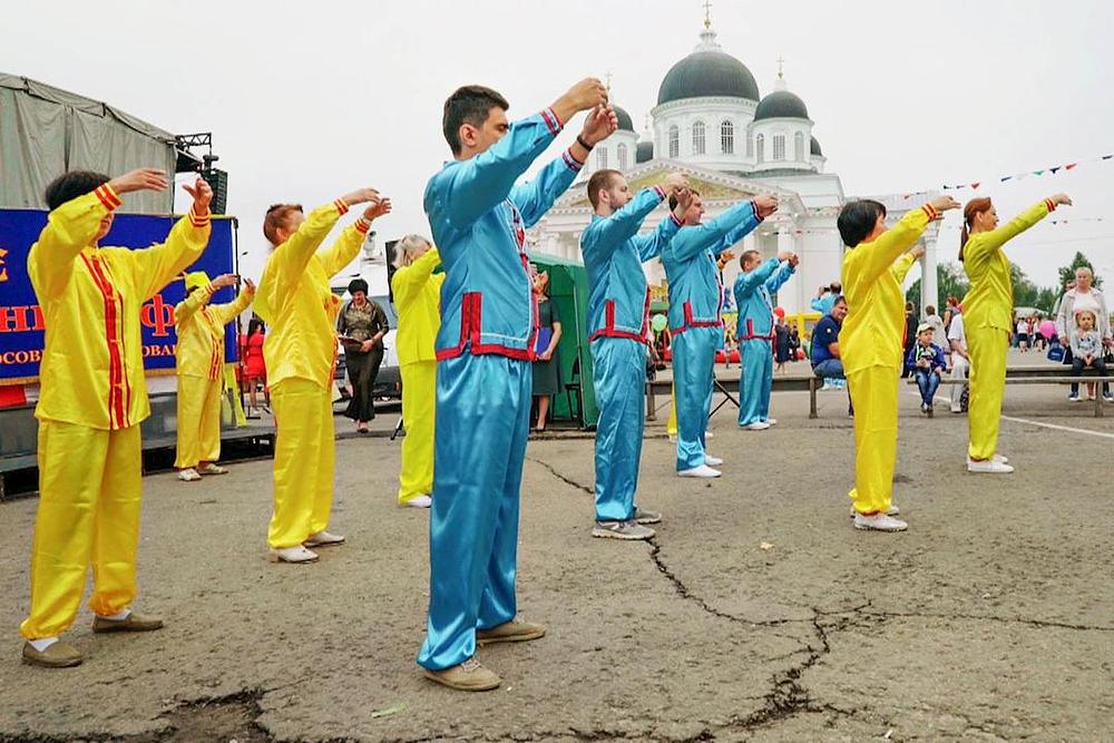 Falun Dafa praktikanti su učestvovali u aktivnostima na uličnom sajmu održanom 1. i 2. septembra 2018. godine u gradu Nižnji Novgorod, koji se nalazi 250 kilometara istočno od Moskve. Nastup je uključivao paradu, demonstraciju izvođenja vježbi i nastup dobošarske grupe, kao i plesače koji su izvodili znajev ples.