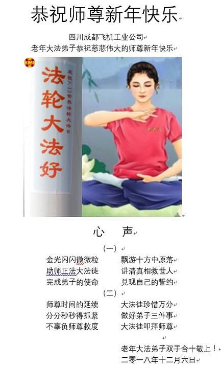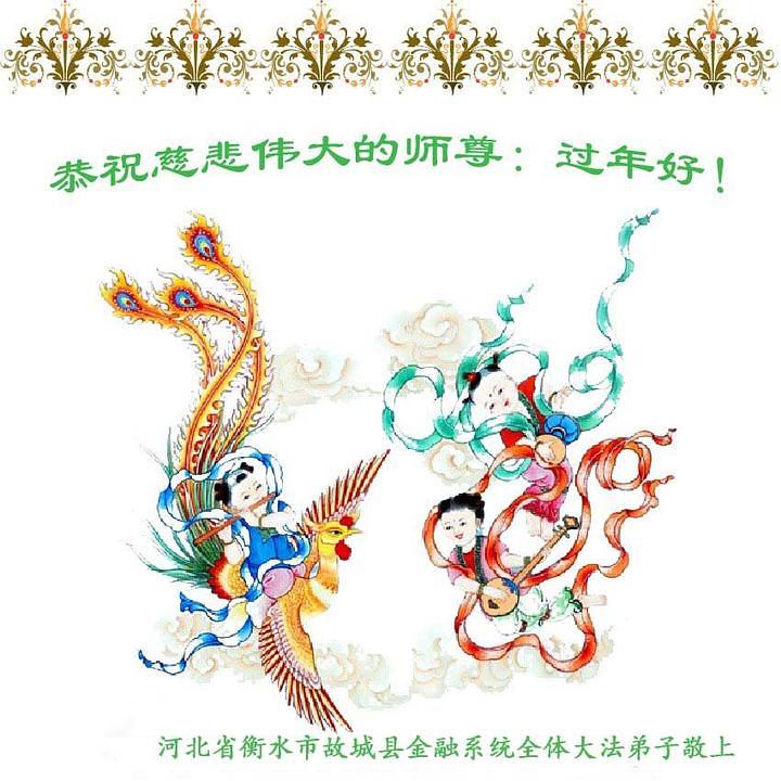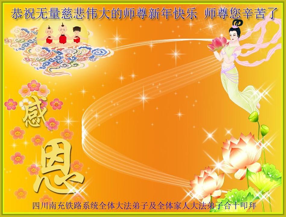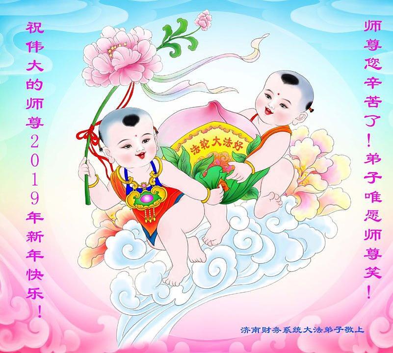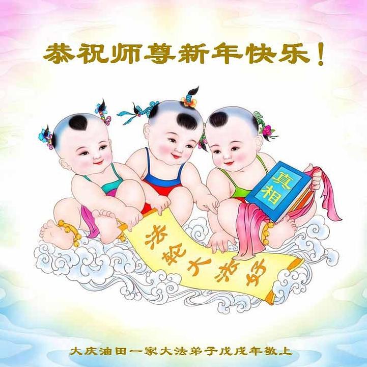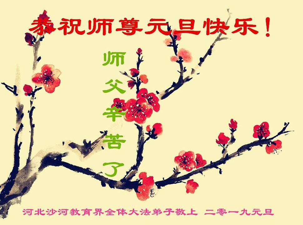 Praktikanti koji rade u sistemu prirodnog gasa u gradu Qinhuangdao u provinciji Hebei su napisali: “Kao Falun Dafa praktikanti, marljivo ćemo slijediti principe Istinitosti-Dobrodušnosti-Tolerancije. Mi sada znamo da kada naiđemo na probleme, to znači da moramo poboljšati naš xinxing. Zahvalni smo Učitelju na tome što nas vodi na putu dok mu mi pomažemo spasavati živa bića. Sretna Nova Godina, Učitelju!”
