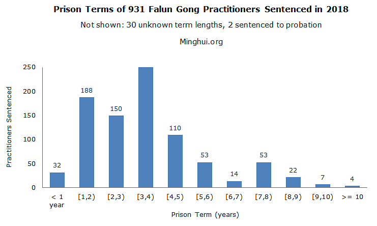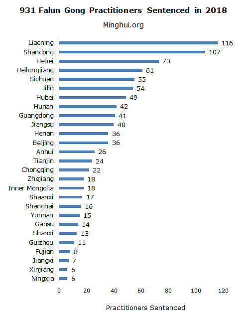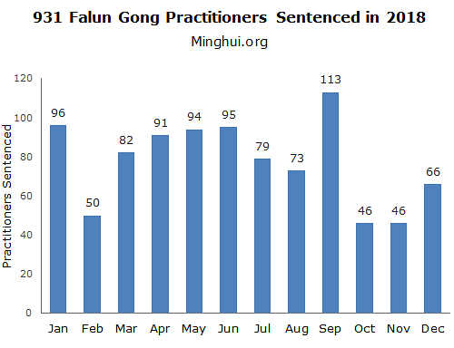 Prema informacijama koje je prikupio Minghui, 931 praktikant Falun Gonga je osuđen na zatvorsku kaznu zbog svoje vjere u 2018. godini.