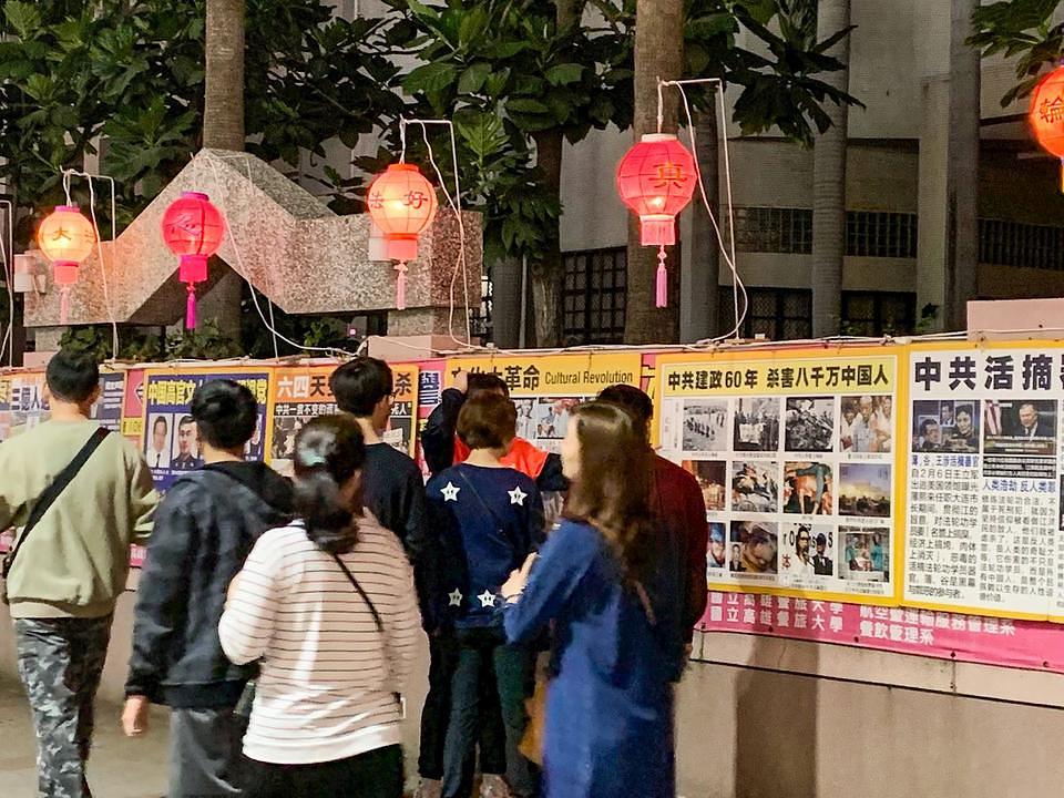 U tridesetak metara puta od Arena metro stanice u Kaohsiungu do noćnog sajma u Ruifengu, pješaci su na sajmu mogli vidjeti plakate s informacijama i fotografijama o širenju Falun Gonga u svijetu, o lažiranju samospaljivanja na trgu Tiananmen koje je izvela KPK da bi podstakla mržnju javnosti protiv Falun Gonga, informacije o žetvi organa uzimanih od živih praktikanata Falun Gonga koju potpomaže kineska država i tužbama protiv Jiang Zemina, bivšeg šefa komunističkog režima koji je započeo progon Falun Gonga.