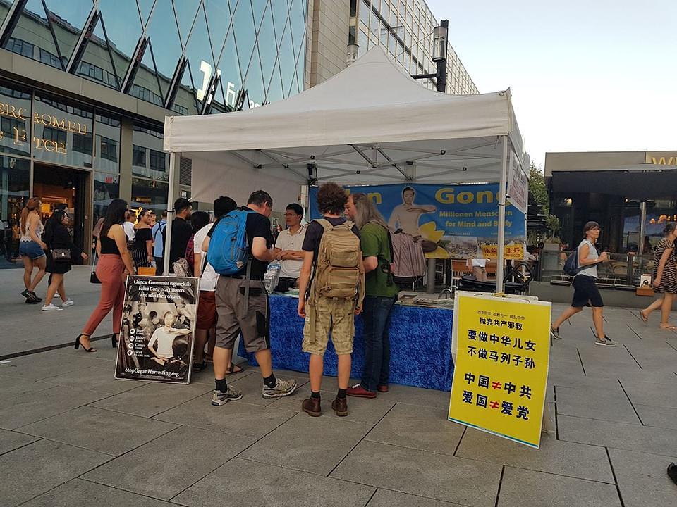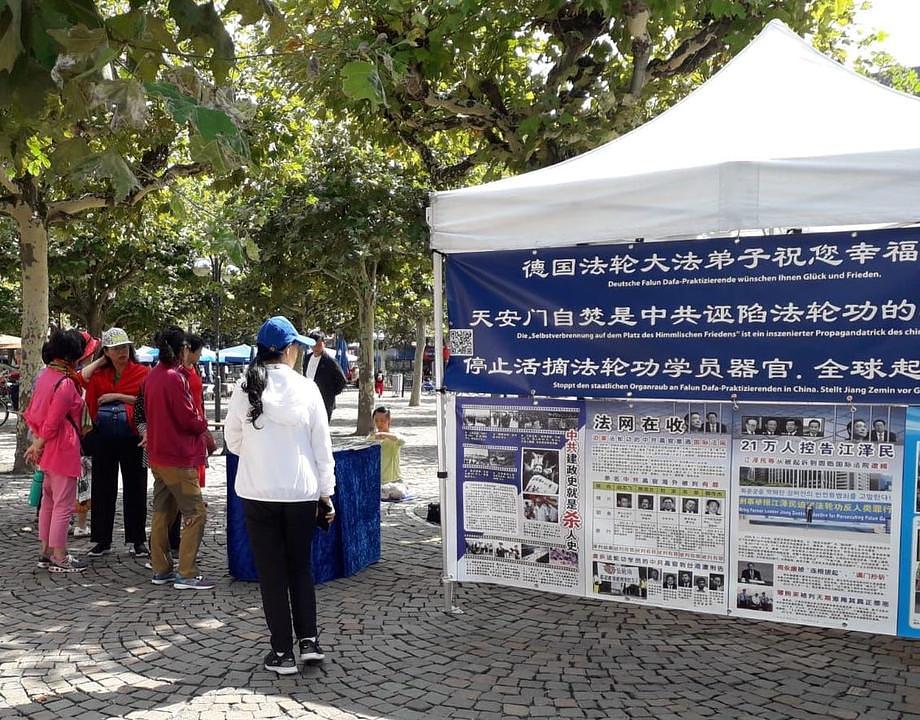 U ulici Zeil, jednom od najpoznatijih i najprometnijih trgovačkih područja, Falun Dafa praktikanti su postavili velike plakate i dijelili informativne materijale na obližnjem štandu u periodu od 30. avgusta i 1. septembra.