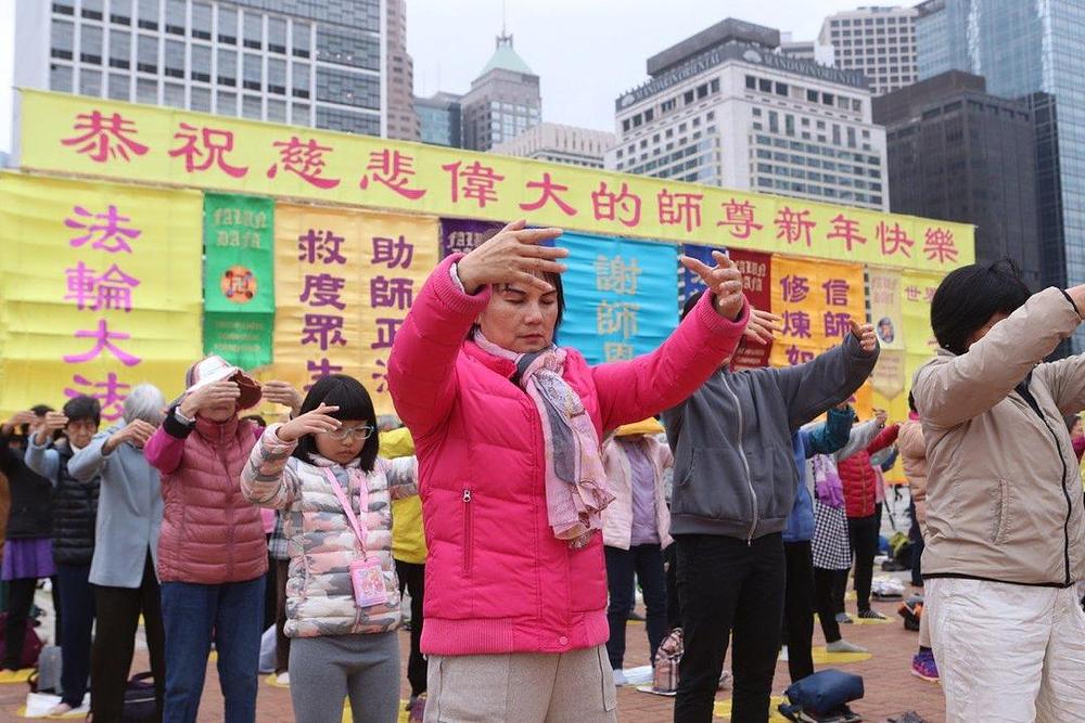 Praktikanti iz Hong Konga su se, 1. januara, okupili na trgu Edinburgh u Središnjem distriktu, gdje su slavili Novu godinu i sa skupa zaželjeli sretnu Novu godinu gospodinu Li Hongzhiju, osnivaču Falun Dafa.