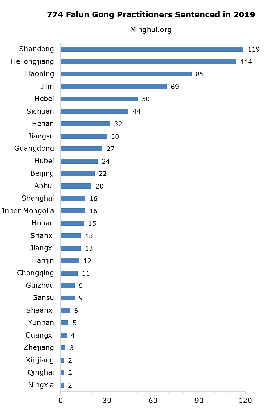 Prema podacima koje je prikupio Minghui.org potvrđeno je da su najmanje 774 praktikanta Falun Gonga osuđeni zbog svoje vjere u 2019. godini.