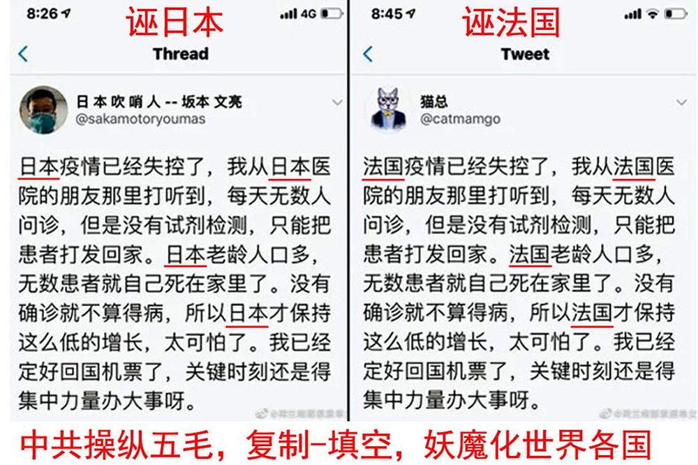 Gornji postovi su se pojavili u WeChat grupama u Japanu, Francuskoj, Unutrašnjoj Mongoliji, i SAD-u, a autori su koristili iste rečenice samo promjenivši naziv zemlje (podvučeno crvenom) u porukama. Poruka na lijevoj strani je iz Švicarske, dok je ona desnoj iz SAD-a. Piše sljedeće: