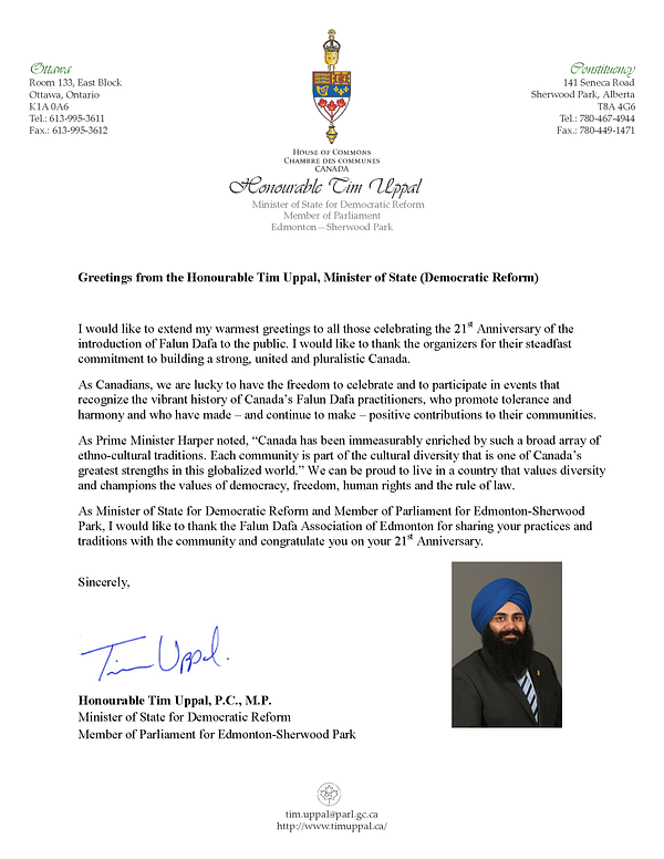 Dan 13. svibanj 2013.g. predstavlja 21. godišnjicu otkako je Li Hongzhi, osnivač Falun Dafa, predstavio Falun Dafa u javnosti. Tom prigodom, vladini dužnosnici iz provincije Alberta poslali su pisma pozdrava u znak priznanja 21. godišnjice Falun Dafa. Ispod se nalaze pisma članova parlamenta Brenta Rathgebera i Tima Uppala.