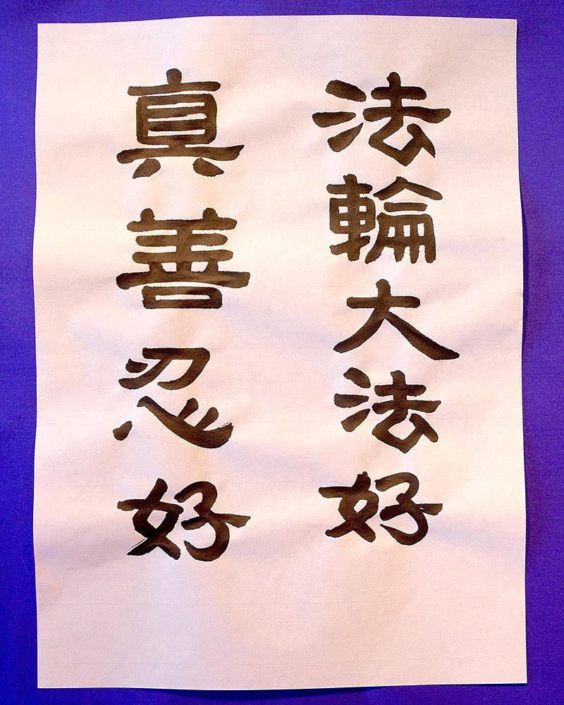 Čestitka Učitelju od zapadnog praktikanta u Švsjcarskoj i njegova kaligrafija “Falun Dafa je dobra,” “Istinitost-Blagost-Trpeljivost su dobri“