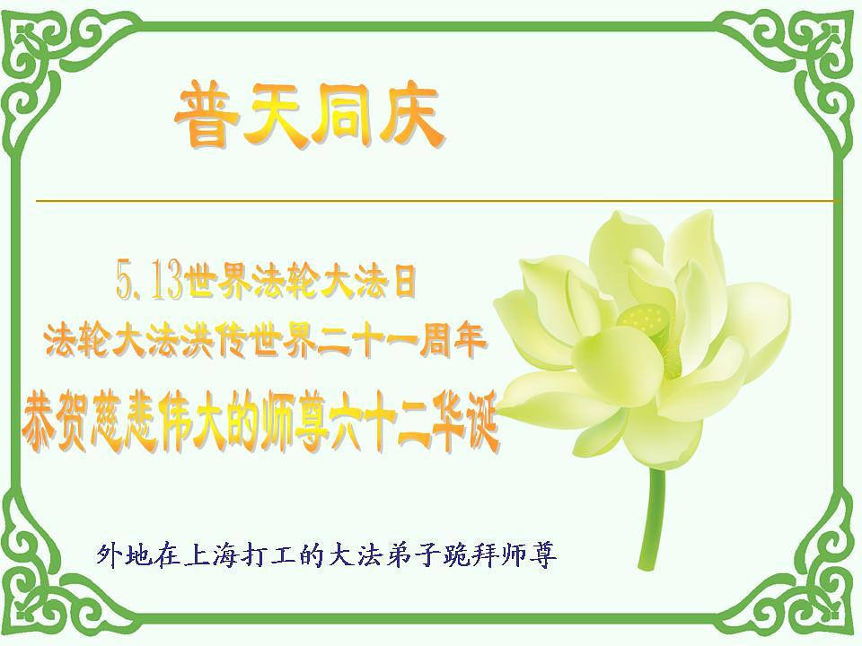 Praktikanti iz sljedećih distrikta i okruga u Šangaju slave Svjetski Falun Dafa dan i 21. obljetnicu predstavljanja Falun Dafa u javnosti! S poštovanjem žele milostivom velikom Učitelju sretan rođendan!