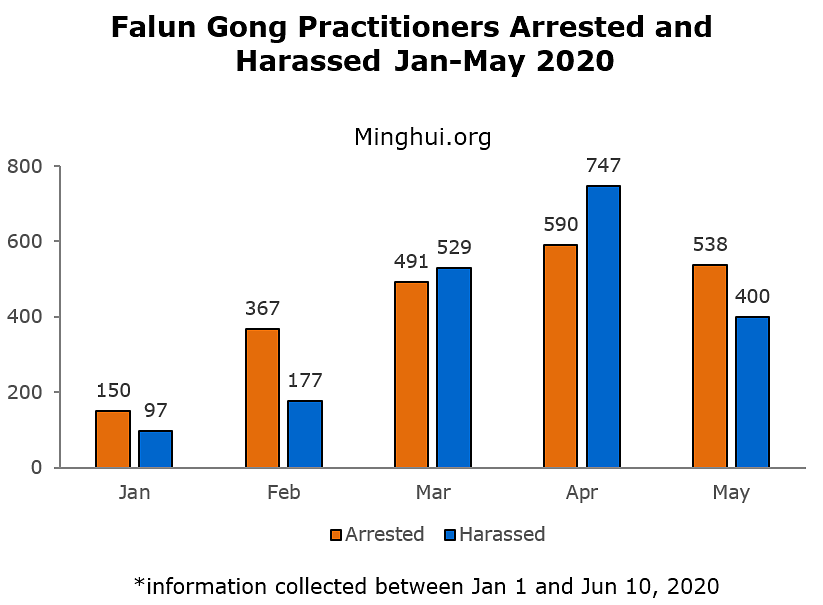 Prema podacima koje je prikupio Minghui.org, u maju mjesecu 2020. godine je zbog svoje vjere uhapšeno 538 praktikanta Falun Gonga, a njih 310 je ostalo u pritvoru u vrijeme pisanja ovoga izvještaja. U istom je mjesecu zabilježeno da je i 400 praktikanata bilo uznemiravano zbog vjere u Falun Gong, uključujući i jednog devedesetdvogodišnjeg profesora i devetogodišnju djevojčicu.