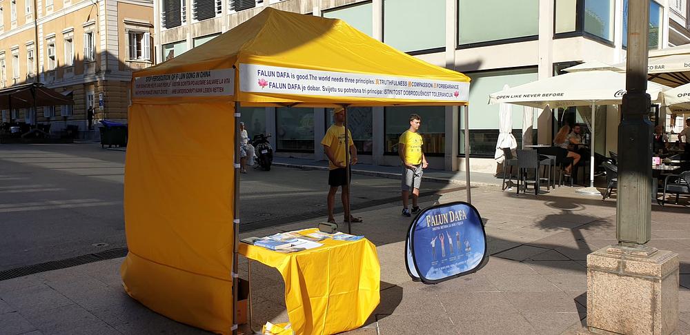 Falun Dafa praktikanti iz Hrvatske i Slovenije održali su 8. srpnja 2020. godine predstavljanje Falun Dafa (naziva se i Falun Gong) u Rijeci, primorskom gradu na sjevernom Jadranu. Događaj je održan u centru grada, na popularnoj šetnici Korzo. Praktikanti su postavili šator i stol s informativnim materijalima, posterima, letcima i Falun Dafa knjigama. Polovica praktikanata je izvodila vježbe, dok je druga polovica dijelila letke i objašnjavala zainteresiranim prolaznicima što je Falun Dafa, odakle potječe, zašto je progonjen u Kini te je informirala ljude o tekućoj žetvi organa od živih Falun Dafa praktikanata u Kini.