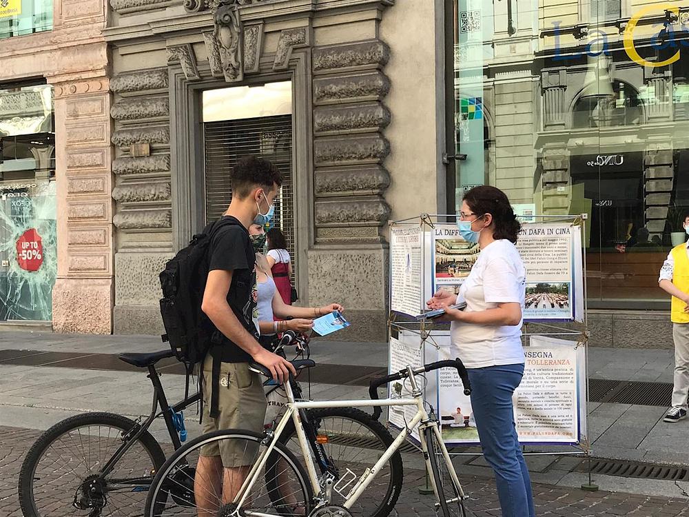 Praktikanti su održali aktivnosti predstavljanja Falun Dafa (naziva se i Falun Gong) u Milanu, u Italiji, 4. srpnja 2020. Oni su razotkrili progon ove prakse od strane Komunističke partije Kine (KPK), posebno žetvu organa od živih praktikanata, odobrenu od vlasti u Kini.