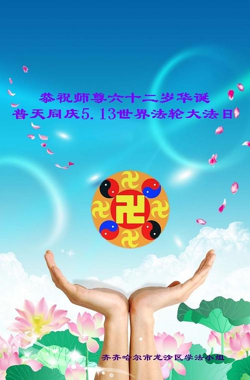 Praktikanti iz sljedećih distrikta u gradu Qiqiharu, u provinciji Heilongjiang slave Svjetski Falun Dafa dan i 21. obljetnicu predstavljanja Falun Dafa u javnosti! S poštovanjem žele milostivom velikom Učitelju sretan rođendan!