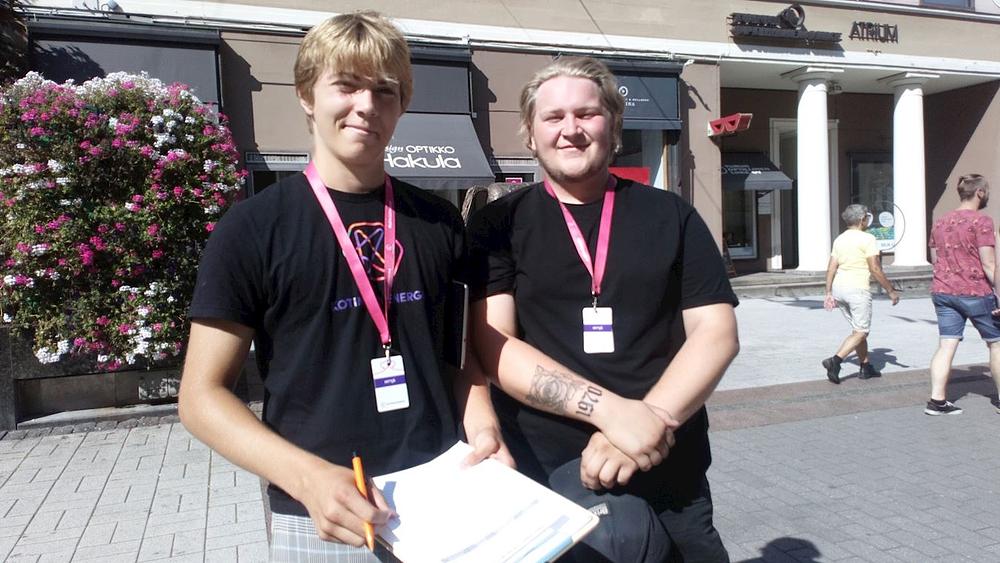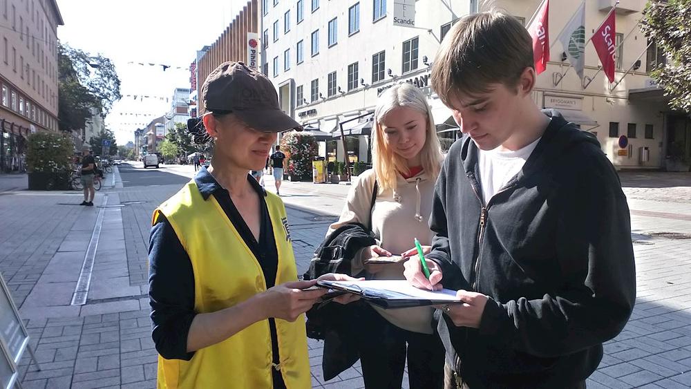 Praktikanti su postavili plakate i transparente na Yliopistonkatu, širokoj ulici u kojoj se trgovine i supermarketi nalaze s obje strane. Praktikanti su s ljudima razgovarali o tome šta je Falun Gong i zašto Komunistička partija Kine (KPK) progoni praktikante u Kini. Nakon što su saznali za surovosti progona, mnogi su građeni potpisali praktikantsku peticiju.