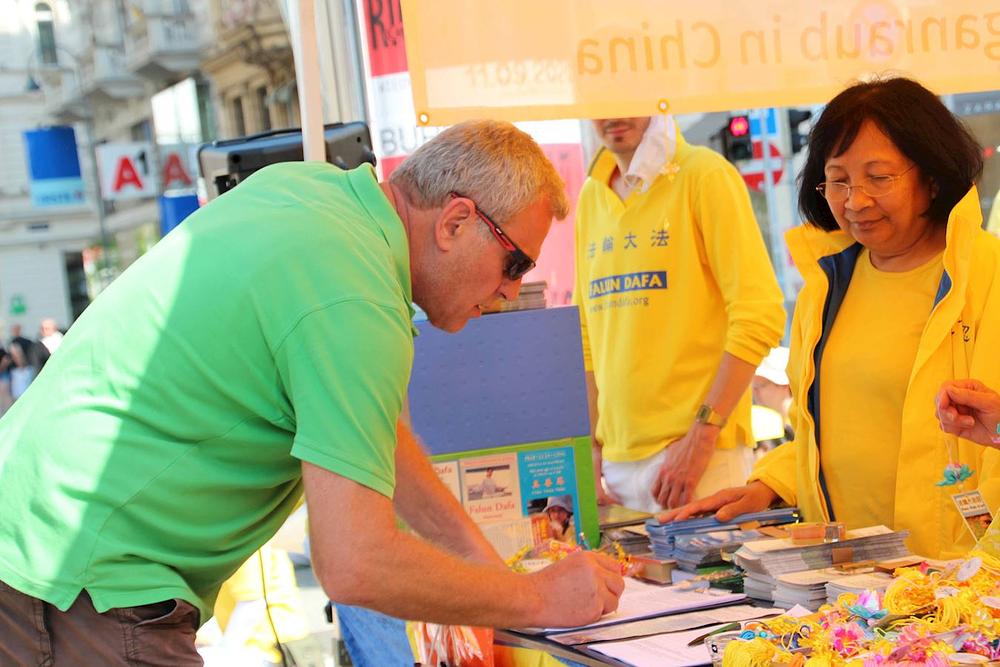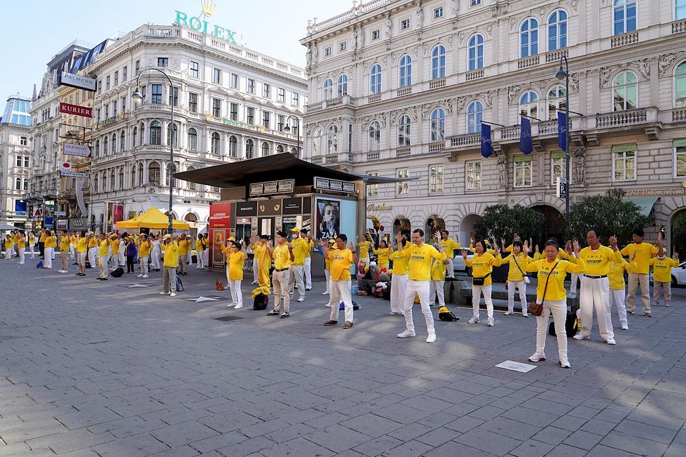 Praktikanti iz obližnjih evropskih zemalja su se okupili na trgu ispred državne opere u Beču u Austriji. Demonstrirali su izvođenje pet Falun Dafa vježbi i ljudima govorili o praksi.