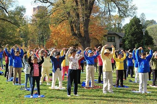 Bio je lijep, sunčan dan. Oko 9 sati ujutro su Falun Gong praktikanti počeli proslavu grupnim izvođenjem vježbi u Fitzroy Vrtu.