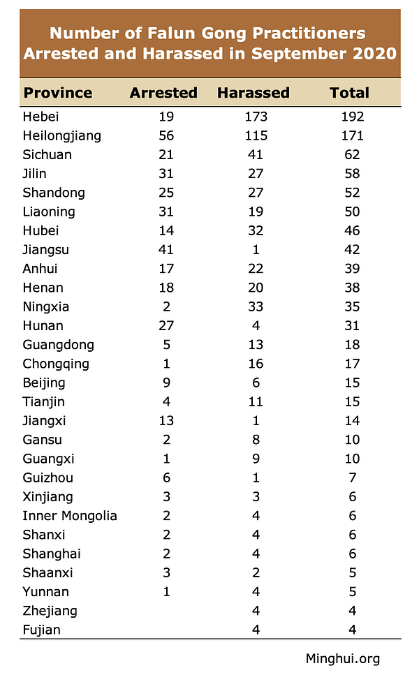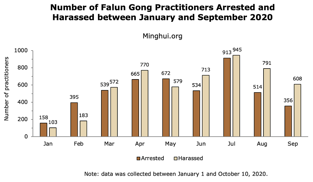 U septembru mjesecu 2020. godine uhapšeno je najmanje 356 Falun Gong praktikanata, a zlostavljano je njih 608 zbog svoje vjere, te na taj način registrovani broj slučajeva hapšenja i zlostavljanja od početka godine do danas iznosi 4.746, odnosno 5.264.