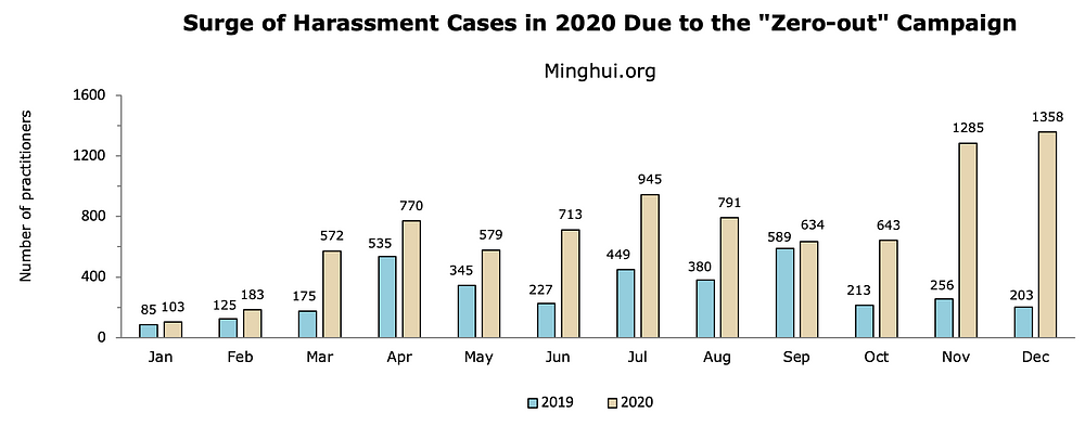 Ulaskom u drugu polovinu godine, broj slučajeva maltretiranja je počelo premašivati broj uhapšenih, zbog kampanje "Nula-praktikanata" koja se vrši na teritoriji cijele države. Slično kampanji maltretiranja "Kucanje na vrata" iz 2017. godine i takozvanoj kampanji "Slamanja bandi" iz 2018. godine, koje su ciljale na praktikante samo zbog njihove vjere, vlasti su posjetile svakog praktikanata sa vladine crne liste i pokušale ih prisiliti da se odreknu Falun Gonga u novoj kampanji "Nula-praktikanata".