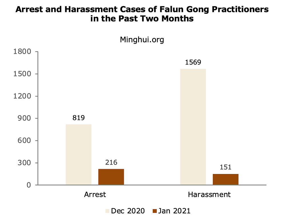 U januaru mjesecu 2021. prijavljeno je 482 hapšenja, uključujući i 266 dodatnih slučajeva iz 2020. godine i 216 novih slučajeva iz januara mjeseca 2021 godine. Istog su mjeseca prijavljena i 734 slučaja maltretiranja, uključujući 583 slučaja iz 2020. godine i 151 iz januara 2021. godine. Novo prijavljeni slučajevi dovode ukupan broj poznatih hapšenja u 2020. godini na 6.925, a ukupan broj slučajeva maltretiranja na 9.159. Konkretno, samo u mjesecu decembru 2020. godine, broj hapšenja je povećan na 819, a slučajeva maltretiranja na 1.569, što procentualno iznosi 12% i 17% na godišnjem planu. Zbog blokade informacija i velikih teškoća u dobivanju informacija iz Kine, ukupan broj uhapšenih i slučajeva uznemiravanja je vjerovatno veći od prijavljenih brojeva.