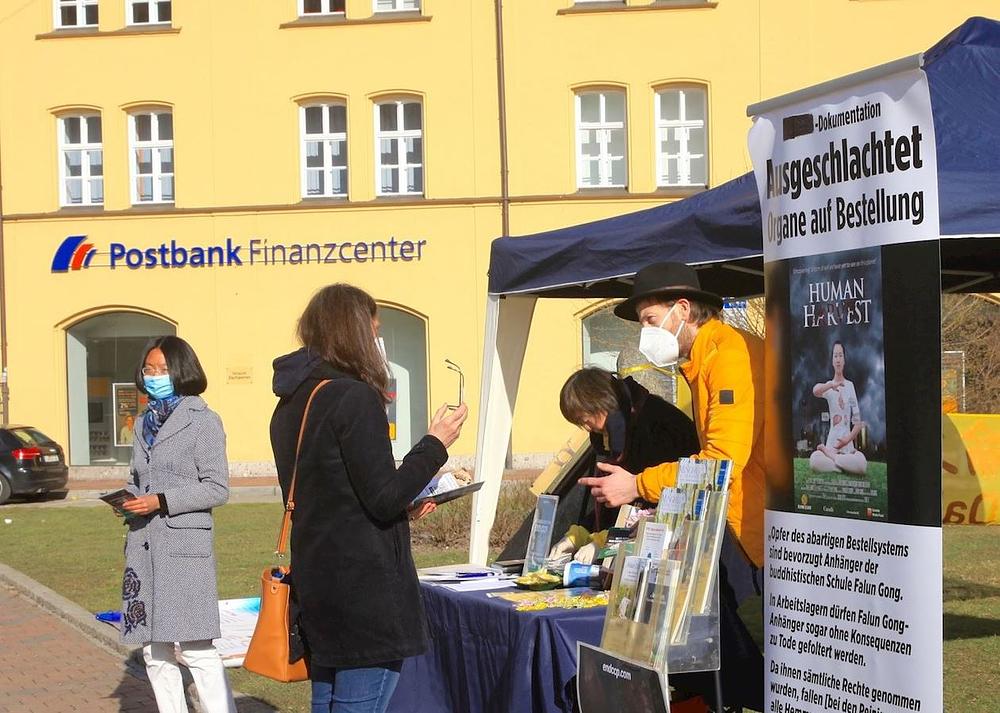 Jedan bračni par srednjih godina je pročitao sve dostupne informacije o progonu Falun Dafa od strane Komunističke Partije Kine (KPK) i posmatrao kako praktikanti rade vježbe. Praktikant Andreas im je govorio o fizičkim i duhovnim blagodatima koje pruža prakticiranje Falun Dafa i govorio o progonu u Kini koji traje već 21 godinu. Suprug je potpisao peticiju kojom se poziva da se okonča prisilna žetva organa koje KPK uzima od živih Falun Dafa praktikanata .