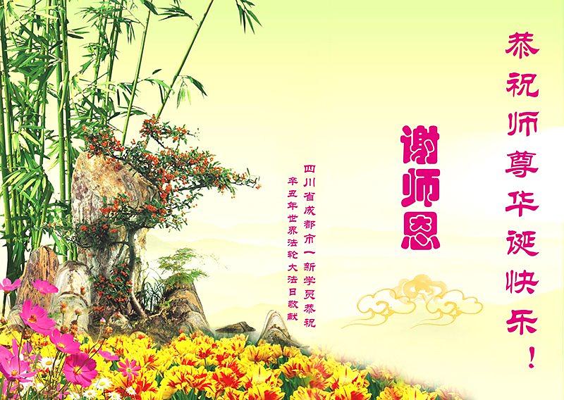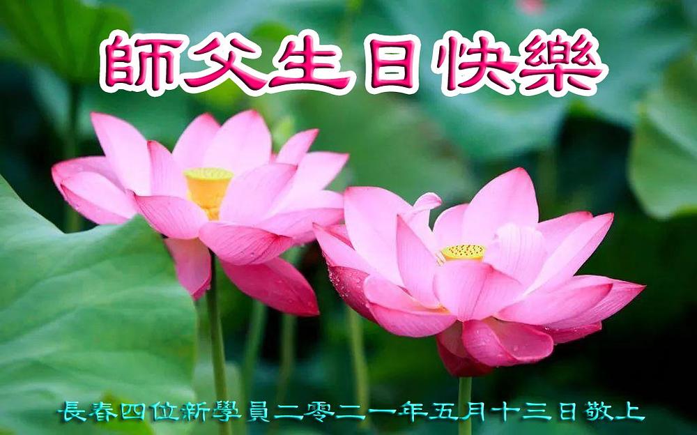 „Povodom Svjetskog Dana Falun Dafa, moja porodica i ja želimo Učitelju sretan rođendan! Iako sam novi praktikant koji prakticira manje od dvije godine, Učitelj se brižno odnosio prema meni. Kad se dobro ne kultiviram, dajete mi nagovještaje i potičete me da se ponašam u skladu s vašim učenjima. Kad radim dobro, potičete me da i dalje budem marljiv. Osjećam kako vrijeme brzo prolazi i žurim sa učenjem Fa, izvođenjem vježbi i prakticiranjem kultivacije."