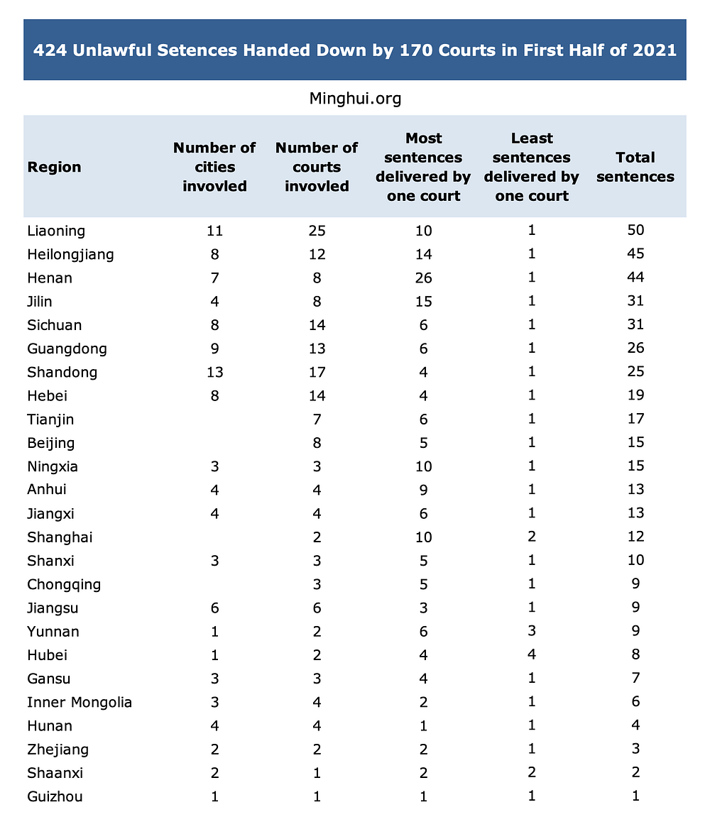 Od 667 slučajeva, poznato je da je 424 (64%) kazne izreklo 170 sudova, uključujući sudove u distriktima, gradske, okružne i gradske sudove. U većini gradova slučajeve su vodili samo jedan ili dva suda. Ovo je nastalo kao rezultat objedinjavanja Falun Gong slučajeva na jednom ili nekoliko sudova i tužilaštava u jednom regionu kako bi se, posljednjih godina, ubrzao postupak gonjenja. Primjere za to uključuju Sud distrikta Chaoyang u gradu Changchunu u provinciji Jilin i okružni sud Ranghulu u gradu Daqingu u provinciji Heilongjiang, oba su suda određena za vođenje Falun Gong slučajeva.