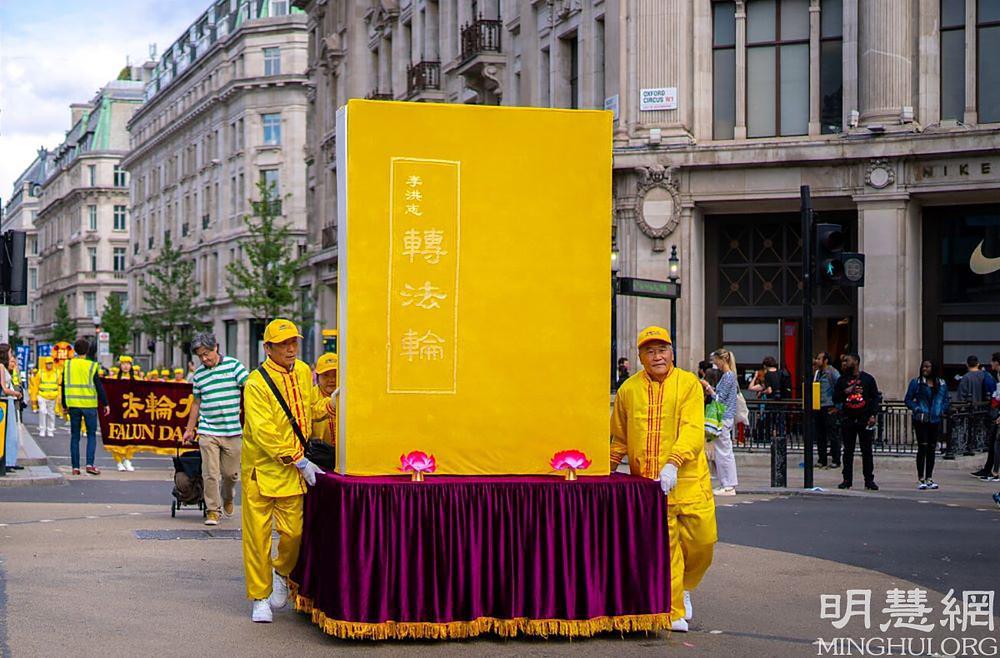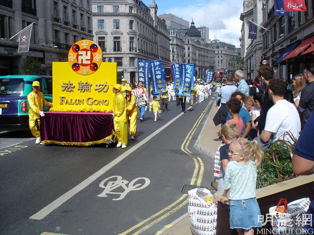Parada, koja je počela u 11:15 časova ispred kineske ambasade, se sastojala od ljudi koji su nosili Falun Dafa transparente, demonstracija izvođenja vježbi, nošenja maketa Falun Dafa knjiga, dobošarske grupe i natpisa koji osuđuju progon Falun Dafa u Kini. Učesnici su prošli najprometnijim dijelovima centralnog Londona, uključujući Regent Street, Chinatown, Trafalgar Square, premijerovu rezidenciju u Downing Streetu, i završili na Trgu ispred parlamenta. Mnogi su se ljudi zaustavljali duž puta kojim se kretala parada da bi je gledali, a neki od njih su paradu fotografisali i snimali svojim mobitelima. Neki od njih su se čak zahvaljivali praktikantima sklapajući dlanove ispred grudi u znak poštovanja.