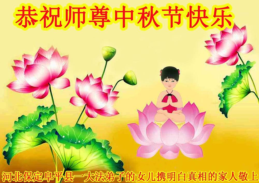 Porodica praktikantice iz grada Baodinga u provinciji Hebei je poželjela Učitelju Liju sretan Praznik sredine jeseni. U svojoj čestitci su napisali: „Moja majka ove godine puni 91 godinu. Otkako je prije dvije decenije počela prakticirati Falun Gong, ona se preobrazila iz osobe koja je od glave do pete patila od raznih bolesti, nesposobne da obavlja bilo koji posao u vrlo zdravu osobu bez ikakve bolesti. Pored toga, ona više nije nagluha, vid joj je dobar, nema sijedu kosu, zubi su joj zdravi a ona hitro obavlja kućanske poslove. Budući da ona prakticira Falun Gong, ja se kao njena kćerka nikada nisam morala brinuti o njenom zdravlju. Prema njenim riječima, o njoj se brine njen Učitelj. Hvala vam, Učitelju, što ste mojoj majci podarili zdravo tijelo. ”