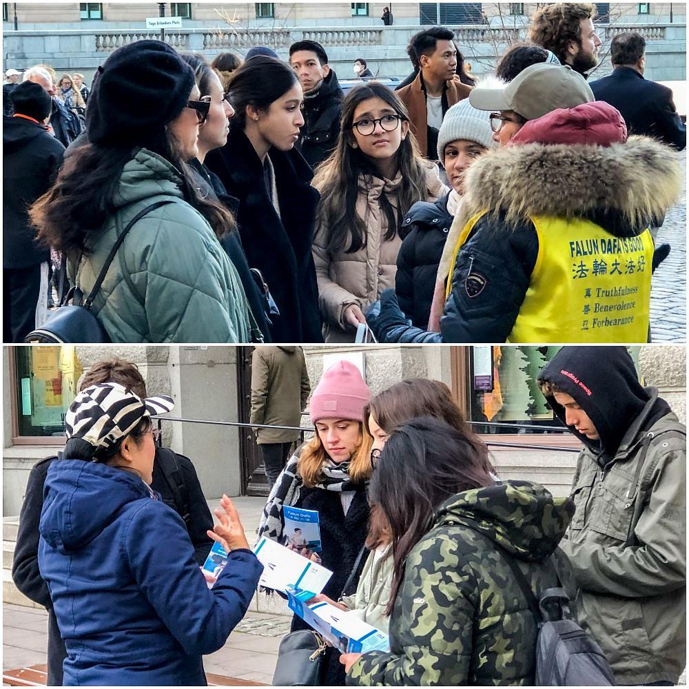 Znajući da su bile zavedeni propagandom KPK, praktikantica im je objasnila kako su milioni ljudi širom svijeta doživjeli fizičko i moralno poboljšanje nakon što su počeli prakticirati Falun Dafa. Ova je praksa nastala u Kini, ali je tamo progonjena, rekla je, dodajući da praktikanti izvan Kine miroljubivo protestuju kako bi se suprotstavili lažima koje je KPK izmislila da bi oklevetala Falun Dafa.