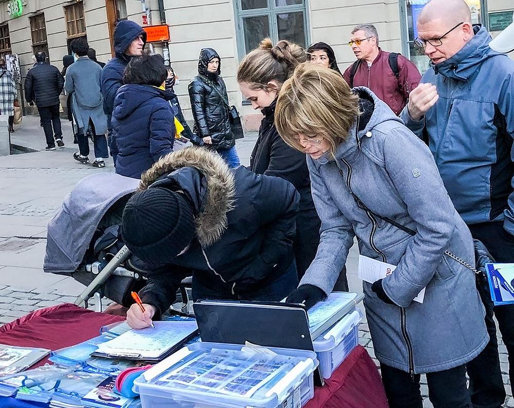 Svake subote popodne, ljudi koji šetaju od centra Stokholma do Starog grada (Gamla Stan) mogu vidjeti Falun Dafa praktikante na javnom trgu, Mynttorget. Kada su saznali kako Komunistička partija Kine (KPK) u Kini zlostavlja praktikante zbog njihovog duhovnog uvjerenja, mnogi prolaznici su bili duboko dirnuti. Jedan je rekao: „Hvala vam što ste bili dobri i hrabri. Ova informacija je važna.”