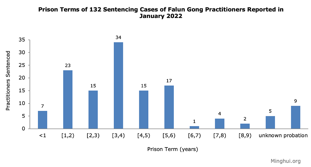 U prvom mjesecu 2022. godine zabilježena su 132 slučaja Falun Gong praktikanta osuđenih na zatvorsku kaznu zbog svoje vjere, uključujući 8 slučajeva koji su se dogodili 2020. godine, 88 slučajeva u 2021. godini i 36 slučajeva u 2022. godini.