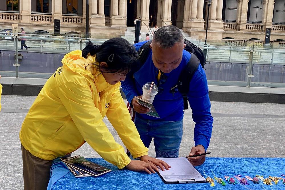 Falun Gong praktikanti su u Queenslandu imali aktivnosti u blizini Brisbane Squarea 23. aprila u znak sjećanja na mirni apel održan u Pekingu prije 23 godine. Demonstrirali su vježbe, postavljali plakate i transparente i dijelili informacije o progonu. Ljudima su objašnjavali da je Falun Gong, koji se naziva i Falun Dafa, progonjen od strane Komunističke partije Kine (KPK) od 1999. godine.