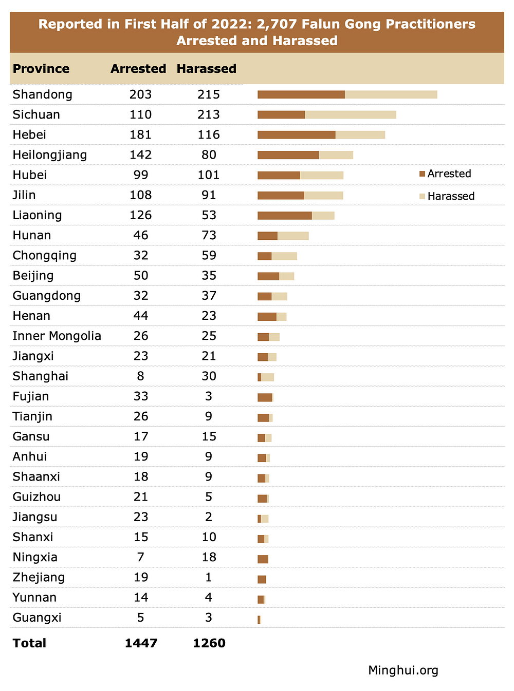 Prema informacijama koje je prikupio Minghui.org, u prvoj polovici 2022. prijavljeno je 2707 slučajeva uhićenja ili maltretiranja Falun Gong praktikanata zbog njihove vjere.
