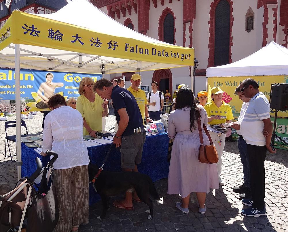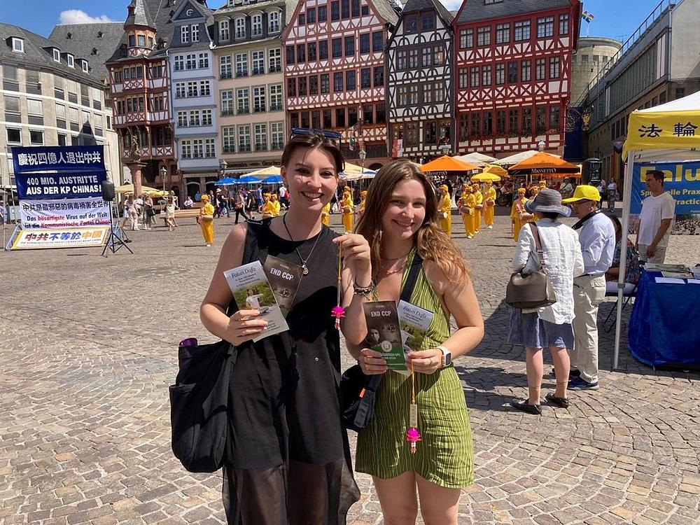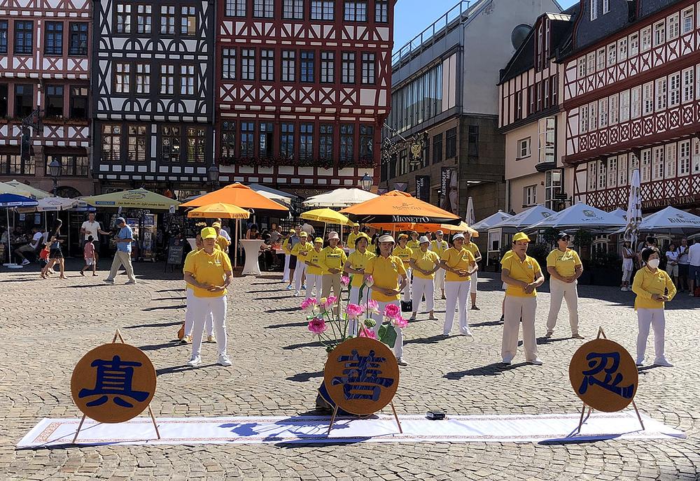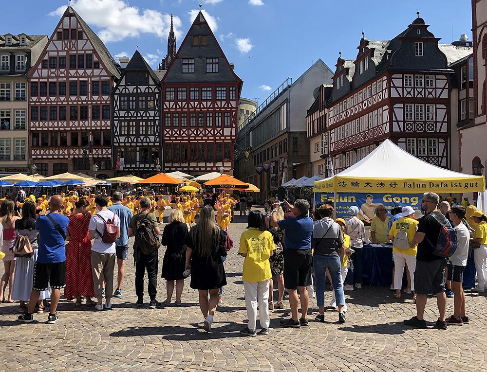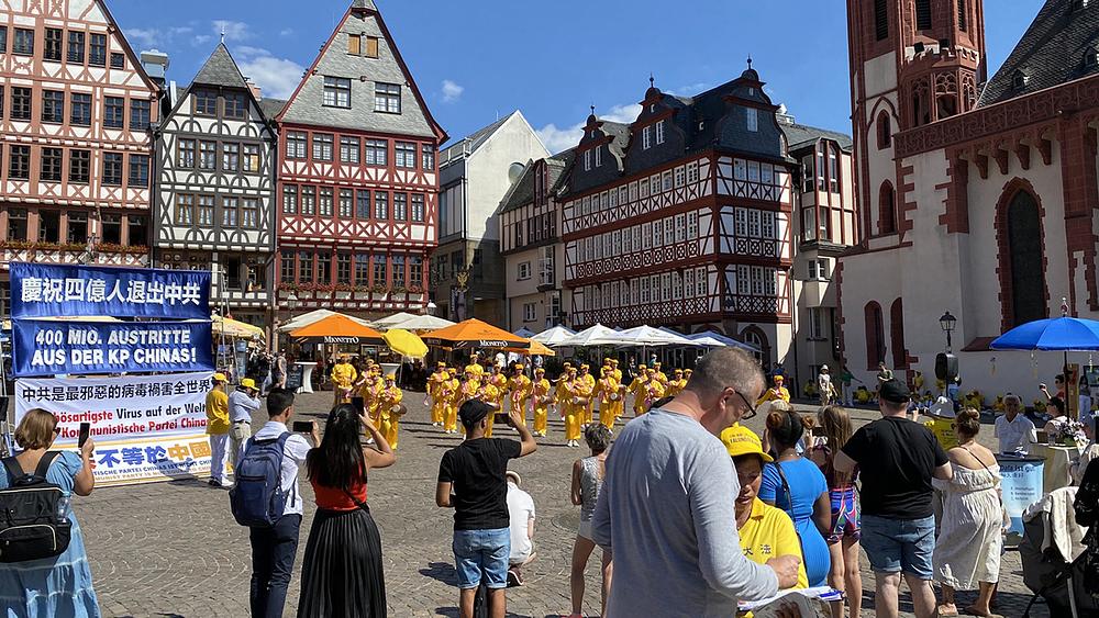 Falun Dafa praktikanti okupili su se u Römerberg-u u Frankfurtu, njemačkom financijskom središtu, 13. kolovoza 2022., kako bi proslavili 400 milijuna ljudi koji su se povukli iz Komunističke partije Kine (KPK). Ovi dnevni događaji uključivali su skup, govore, plesove zmajeva, plesne izvedbe bubnjeva i demonstracije vježbi. Praktikanti su dijelili letke, objašnjavali važnost ovih aktivnosti i skupljali potpise na peticiji za prekid progona u Kini.