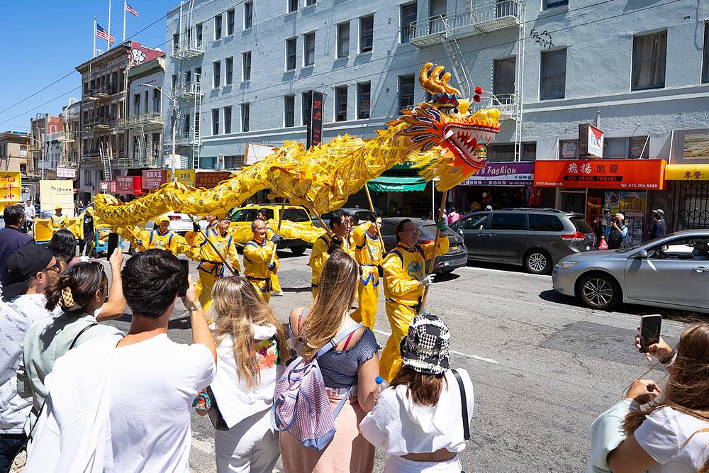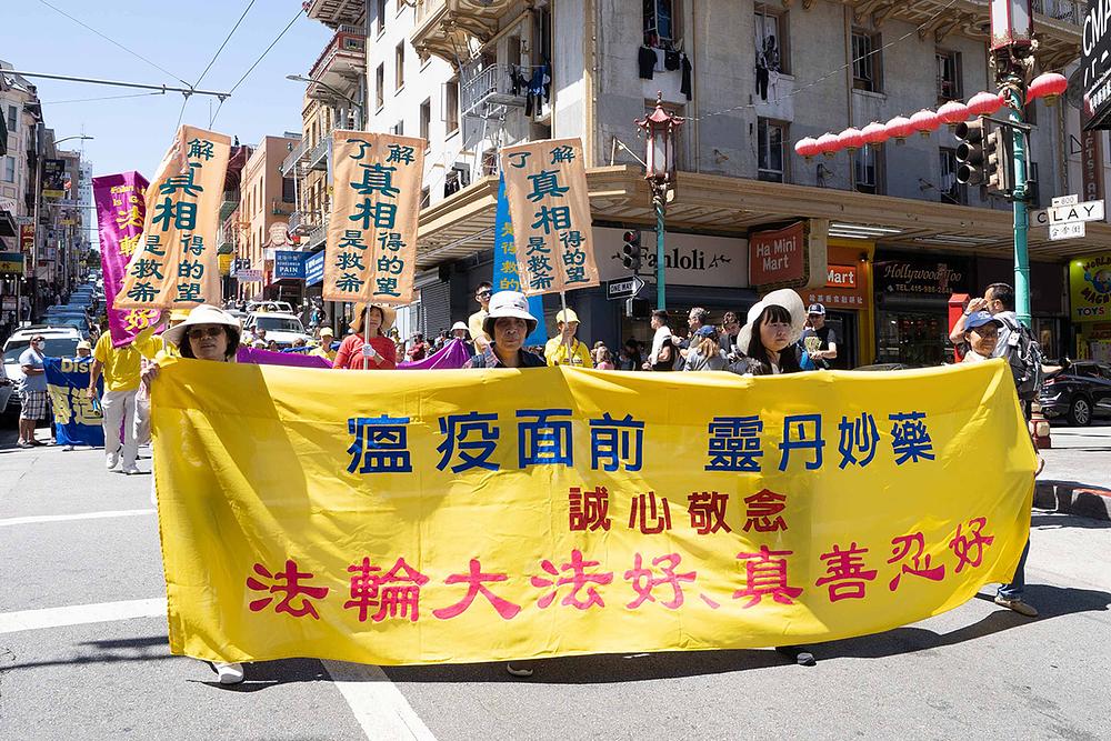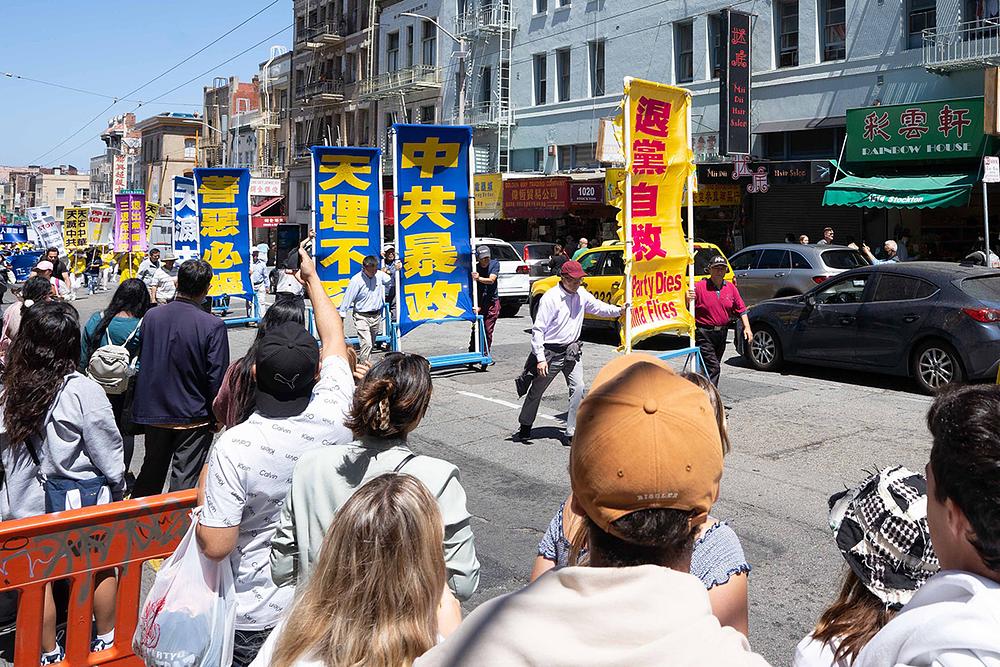 Povorka, sastavljena od nekoliko dijelova, krenula je u 12 sati od Trajektne zgrade. Praktikanti su marširali glavnim ulicama San Francisca prije ulaska u Kinesku četvrt i završetka na Portsmouth Squareu. Ne-praktikanti koji su se pridružili paradi pozvali su svoje kineske sunarodnjake da sagledaju prirodu KPK i da se odvoje od režima kako bi imali svijetlu budućnost.