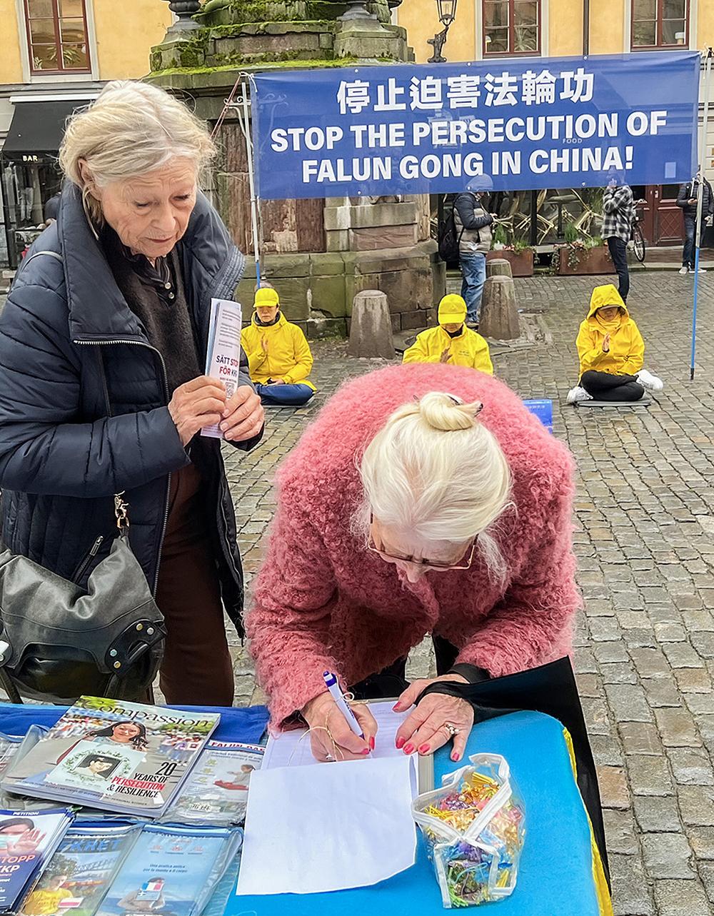 Sezona zlatne jeseni odlično je vrijeme za putovanje u Švedsku, a dobitnici Nobelove nagrade za mir objavljuju se u listopadu. Turisti iz cijelog svijeta i lokalno stanovništvo mogli su vidjeti kako Falun Dafa praktikanti predstavljaju praksu uma i tijela ispred Muzeja Nobelove nagrade svakog petka i subote poslijepodne u listopadu. Mnogi su ljudi izrazili svoje poštovanje prema nepokolebljivoj upornosti praktikanata u razotkrivanju progona u Kini. Mnogi od njih potpisali su peticiju kojom pozivaju na prestanak zločina.