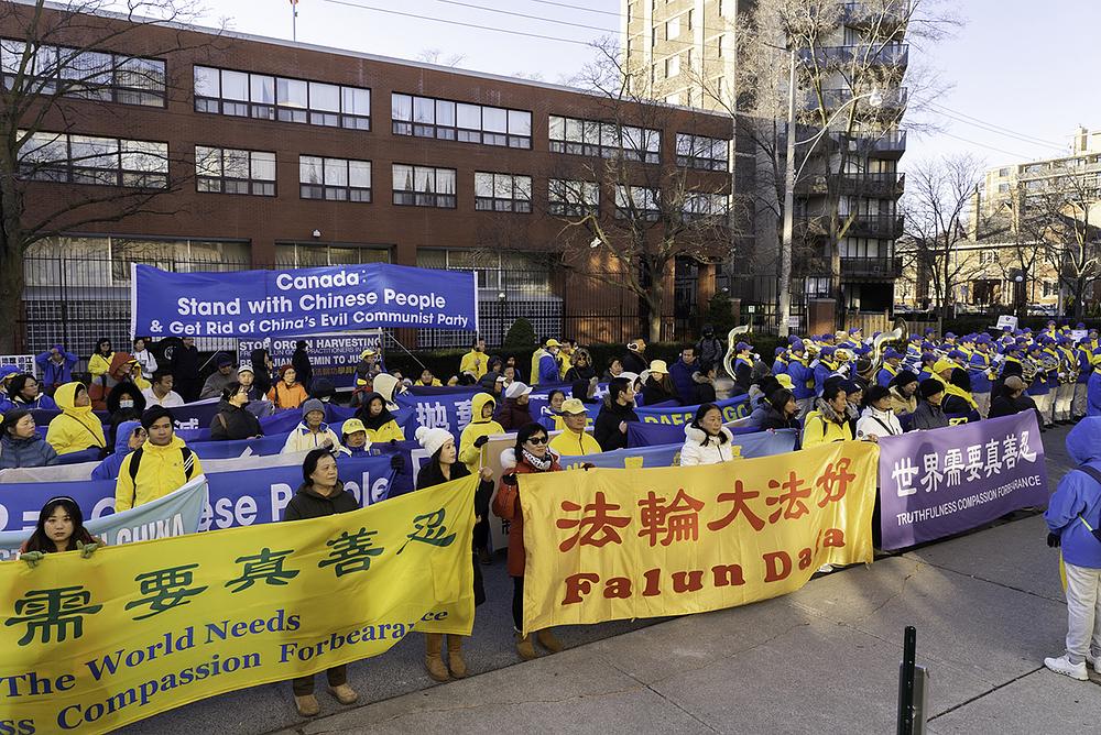 Potom su marširali do kineskog konzulata u Torontu i nastavili skup. Policijska vozila su blokirala obje strane puta ispred kineskog konzulata kako bi omogućila održavanje marša. Govornici na skupu su osudili progon koji vrši KPK i izrazili svoju podršku naporima kineskog naroda da se odupre ugnjetavanju KPK.
