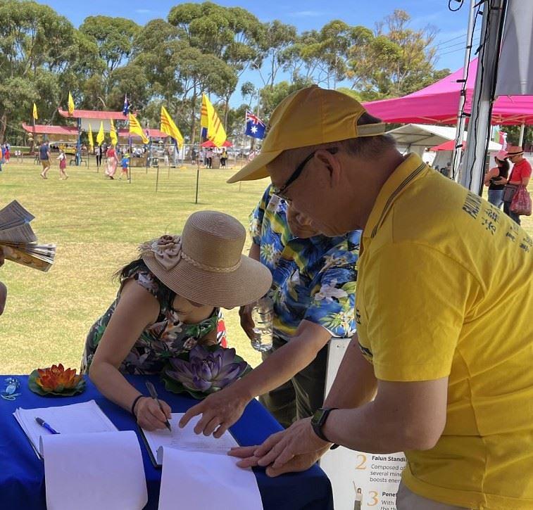 Turistkinja iz Canberre je naišla na štand i zagrlila praktikanticu. Rekla je da radi u vladinoj ustanovi i često viđa praktikante kako podižu svijest o progonu ispred kineske ambasade u Canberri. Ona je pohvalila praktikantsku odlučnost i upornost.