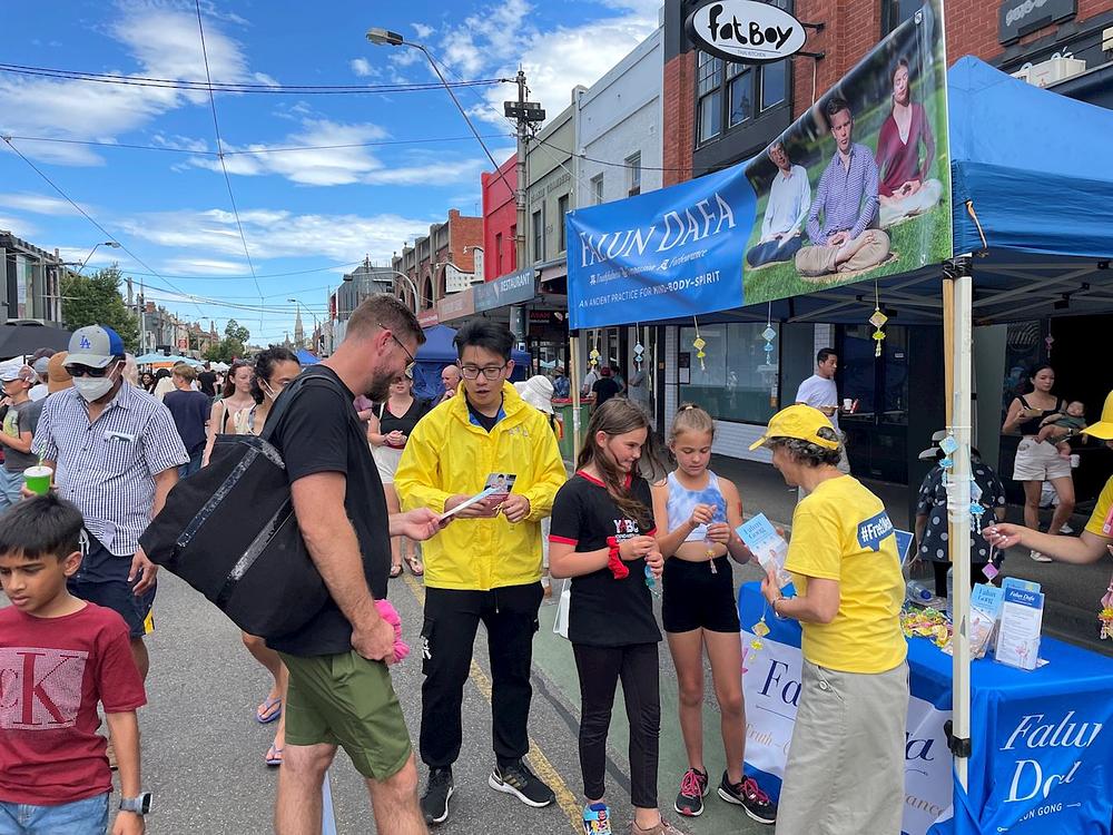 Glenferrie festival je jedan od najvećih lokalnih festivala u Melburnu i privlači mnoge porodice zajedno sa njihovom djecom da navrate i probaju hranu i učestvuju u raznim zabavnim aktivnostima. Praktikanti su demonstrirali Falun Dafa vježbe i podijelili mnogo informativnih letaka tokom ove jednodnevne manifestacije. Mnogo ljudi iz različitih etničkih grupa i uzrasta su zastali pored Dafa štanda kako bi saznali više o ovoj praksi. Neki su i na licu mjesta naučili vježbe.