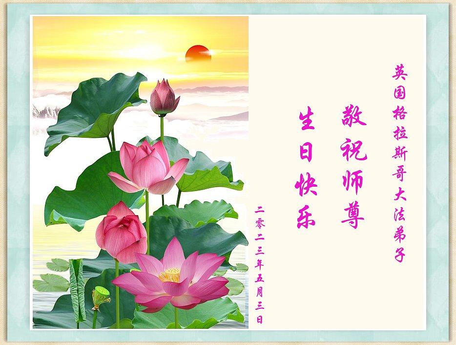 Falun Dafa praktikanti iz online grupe za učenje Fa u Ujedinjenom Kraljevstvu slave Svjetski Falun Dafa Dan i žele poštovanom Učitelju sretan rođendan!