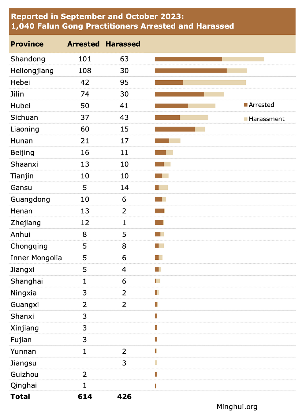 Među 614 slučajeva uhićenja, jedan se dogodio 2021., 69 u prvoj polovici 2023., 50 u srpnju, 94 u kolovozu, 280 u rujnu i 121 u listopadu u 2023. Od 426 slučajeva uznemiravanja, 54 su se dogodila u prvoj polovici 2023., 33 u srpnju, 56 u kolovozu, 189 u rujnu i 94 u listopadu 2023. Zbog stroge cenzure informacija u Kini, slučajevi progona ne mogu se uvijek prijaviti na vrijeme, niti su sve informacije lako dostupne.