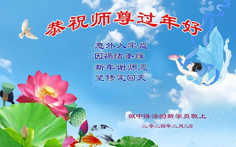 U čestitki koju je poslala nova praktikantica, piše da je upoznala praktikanta dok je bila držana u pritvorskom centru. Nakon što je čula činjenice o Dafa, složila se s njim i naučila kako raditi sjedeći meditaciju u punom položaju lotosa. Osim toga, recitirala je rečenice „Falun Dafa je dobar“ i „Istinitost-Dobrodušnost-Tolerancija je dobra“ puno puta tijekom dana. Nakon što je poslana u zatvor, molila se za susret s drugim praktikantima i srećom je dobila aranžman da bude u ćeliji s jednom praktikanticom. „Bila je dobro obrazovana i lijepog ponašanja. Od nje sam naučila više Dafa učenja. Pomagala sam i drugim praktikantima koliko sam mogla”, napisano je u čestitki. „Cijenim sve ove prilike i biti ću bolja u praksi kultiviranja.“