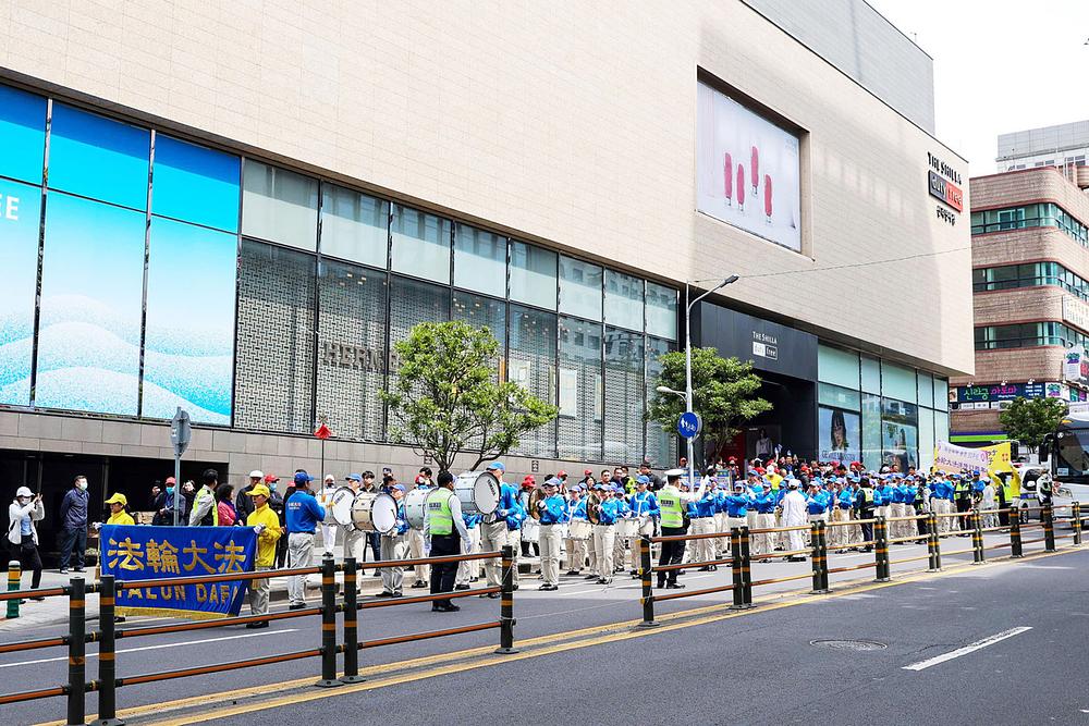 Shilla Duty-Free nije samo tržni centar, već turistička atrakcija. Privučeni uzbudljivom muzikom orkestra Tian Guo Marching Band, mnogi turisti su zastali da pogledaju. Neki od njih su podržali praktikante. Jedan kineski turista je povikao: „Falun Dafa je dobra!“ Istinitost-Blagost-Trpeljivost su dobri!" “Kinezi žele da vam se zahvale!”