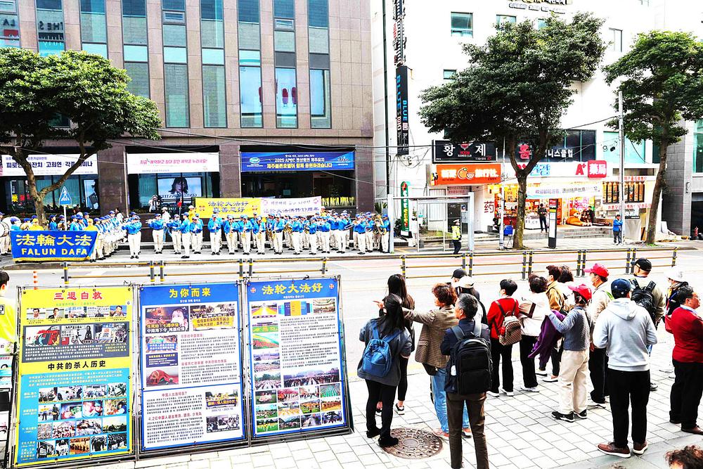 Najveće južnokorejsko ostrvo, ostrvo Jeju je popularna turistička destinacija i često se naziva Havajima u Koreji. Ulazak bez viza takođe privlači mnoge turiste, posebno one iz susedne Kine. Impresionirani prelepim paradama praktikanata Falun Dafe, posebno nastupima Tian Guo Marching Band-a, kineski turisti su dali veliku podršku. Neki su praktikantima podigli palac, a jedna žena je povikala: „Falun Dafa je dobra!“ Istinitost-Blagost-Trpeljivost su dobri!"