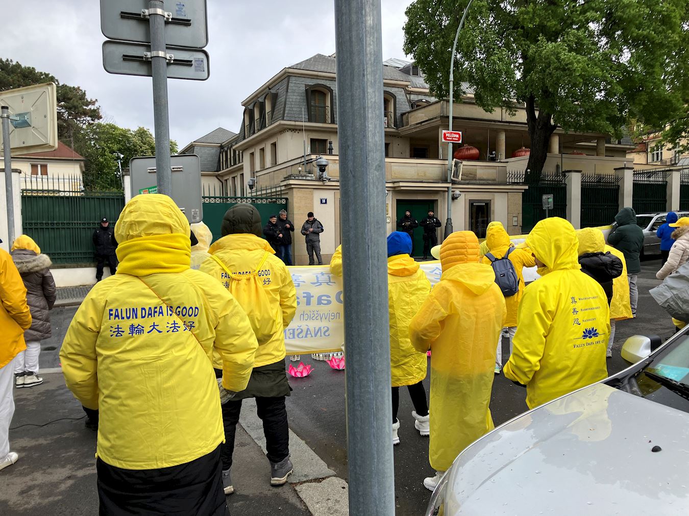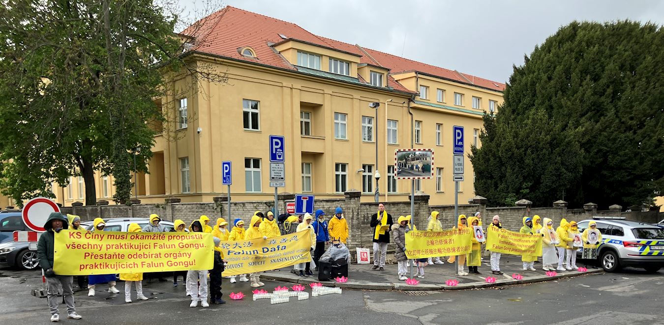Tog popodneva, praktikanti su otišli pred kinesku ambasadu u Pragu i mirno stajali držeći transparente duž naspramnog zida kako bi ih mogli videti oni u ambasadi. Nekoliko sati su u tišini držali transparente i radili vežbe.