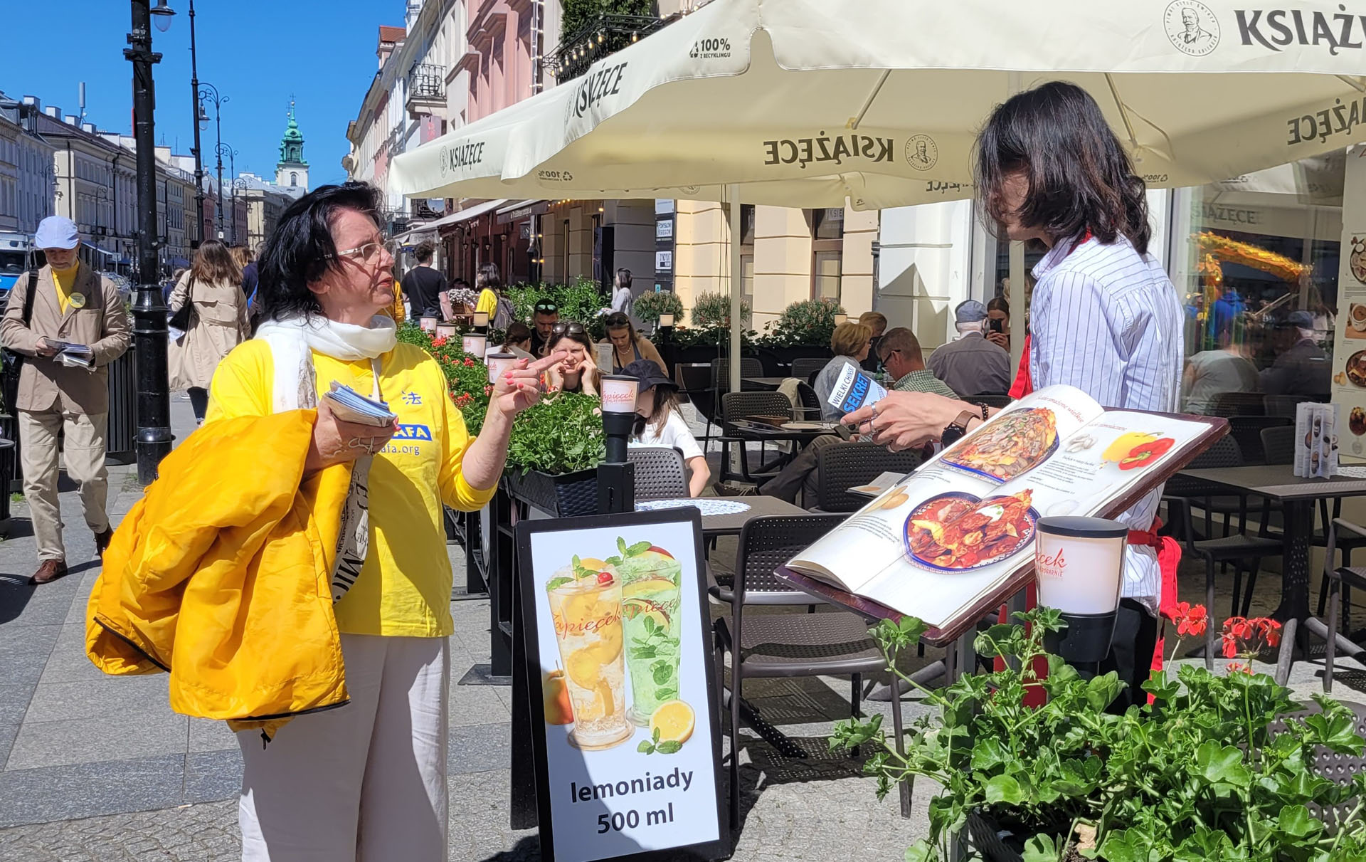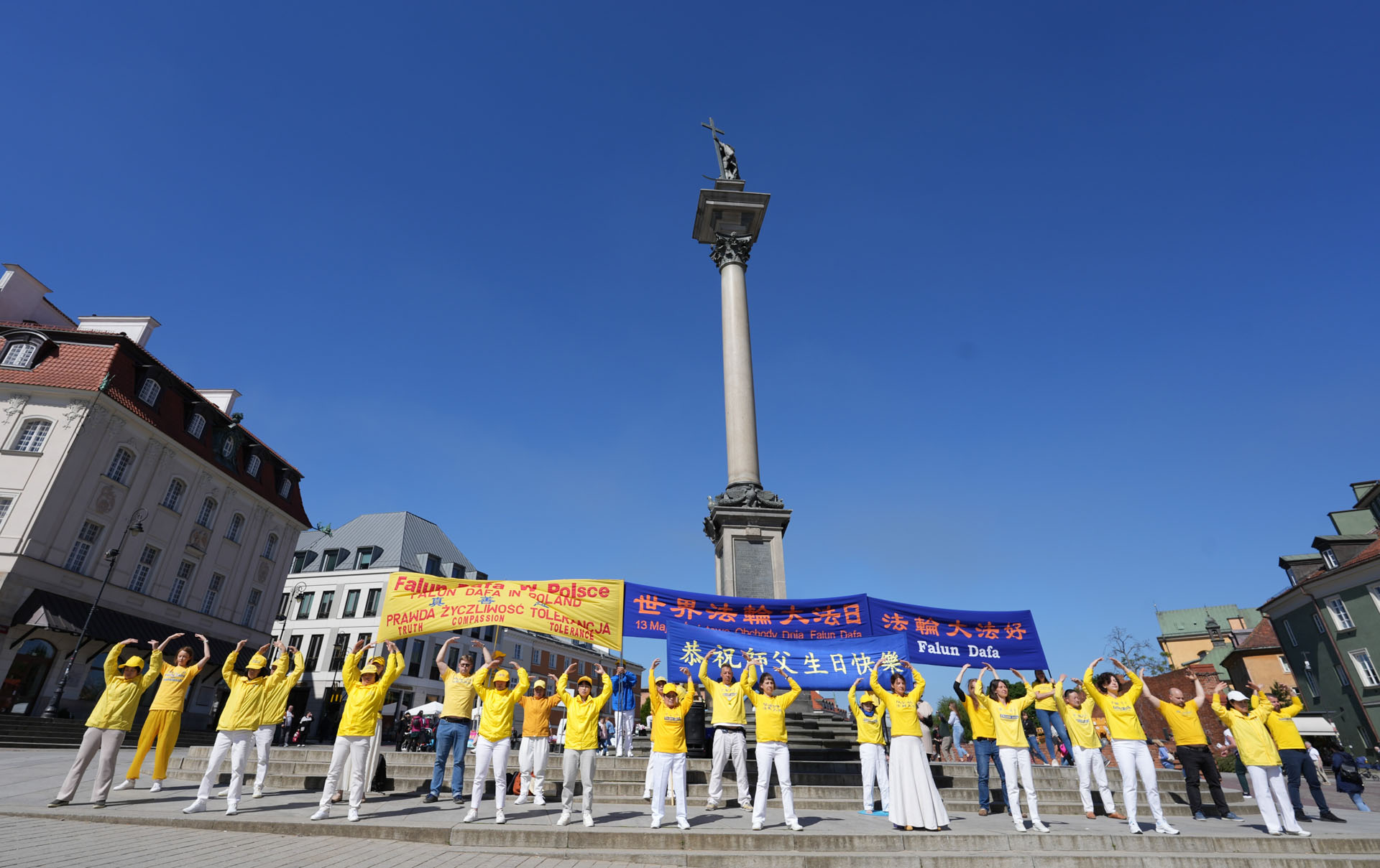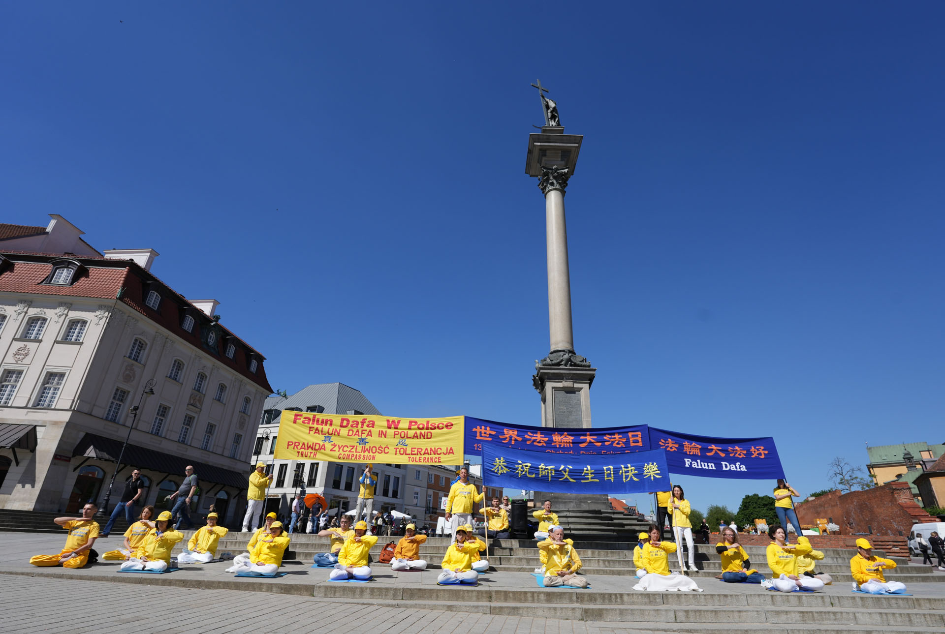 Praktikanti su u Poljskoj, 12. maja 2024., održali ktivnosti na Starom gradskom trgu u Varšavi kako bi proslavili 32. godišnjicu predstavljanja Falun Dafa javnost, koja je ujedno i Svjetski dan Falun Dafa.