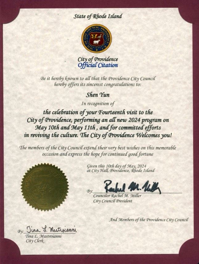 Prije nastupa Shen Yuna u Providenceu, Rhode Island, 11. maja, kompanija je primila čestitke od državnih i gradskih izabranih zvaničnika.